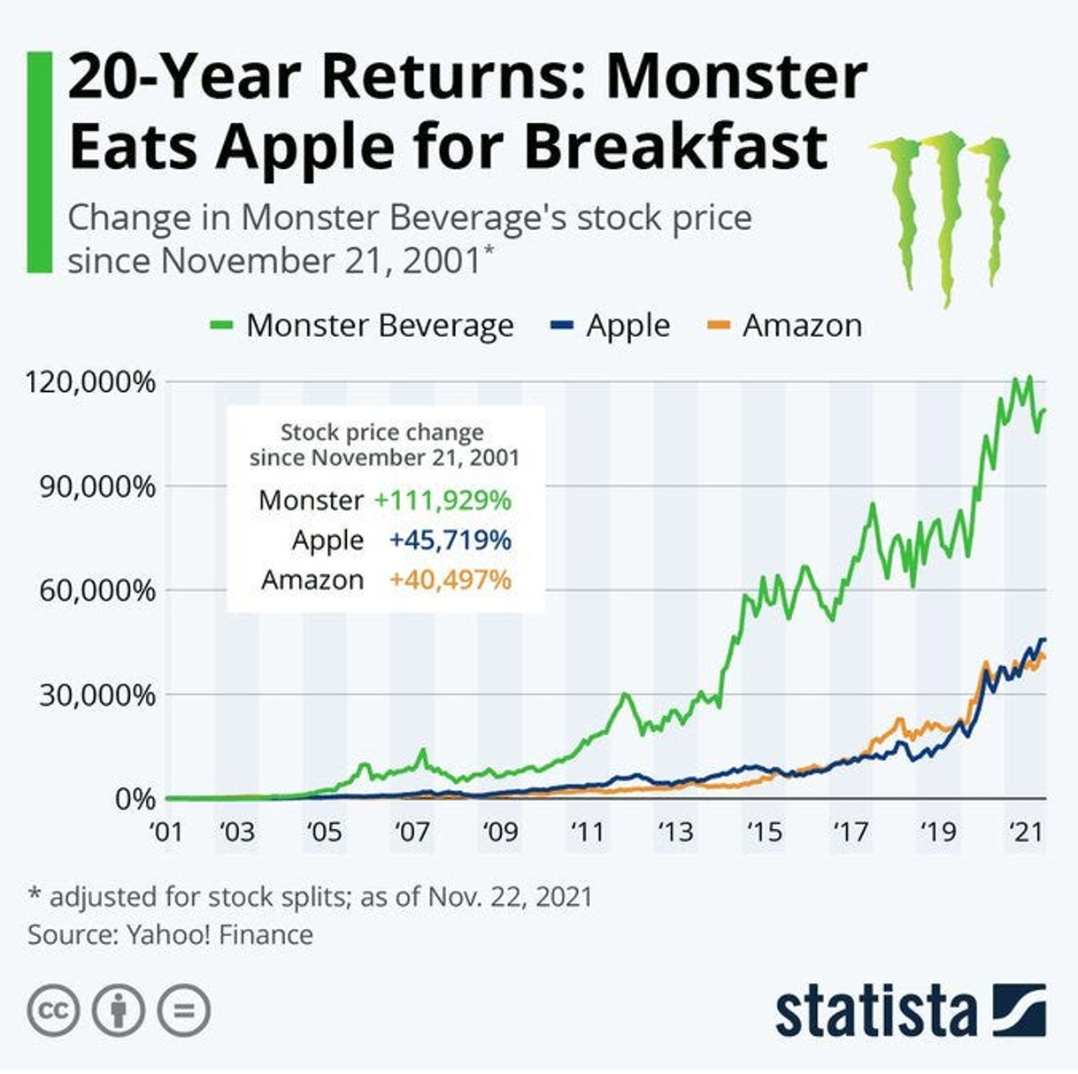 Stel je maar eens voor dat je Monster Beverage voor $0,01 had verkocht in 1987 of Apple voor $0,30 in 1991.