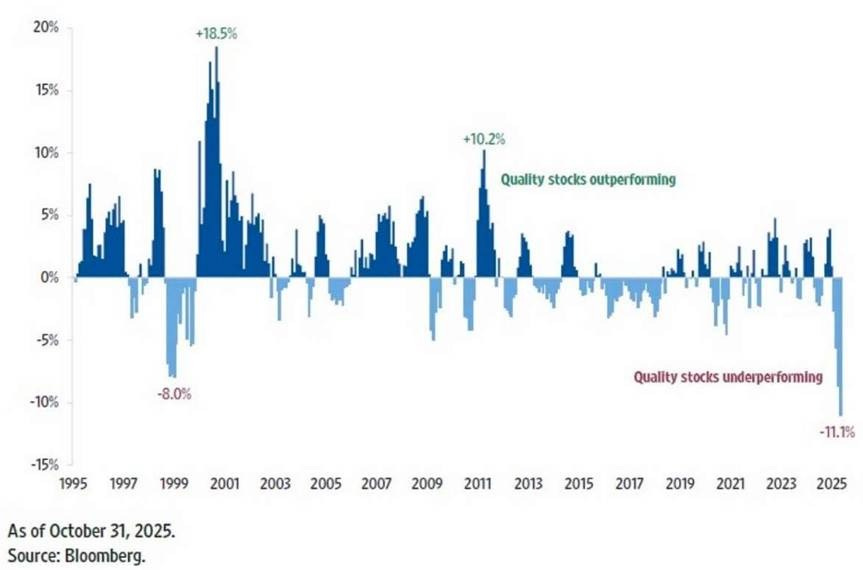 Kwaliteitsaandelen zijn ten opzichte van de markt nog nooit zo goedkoop geweest als in 1999.