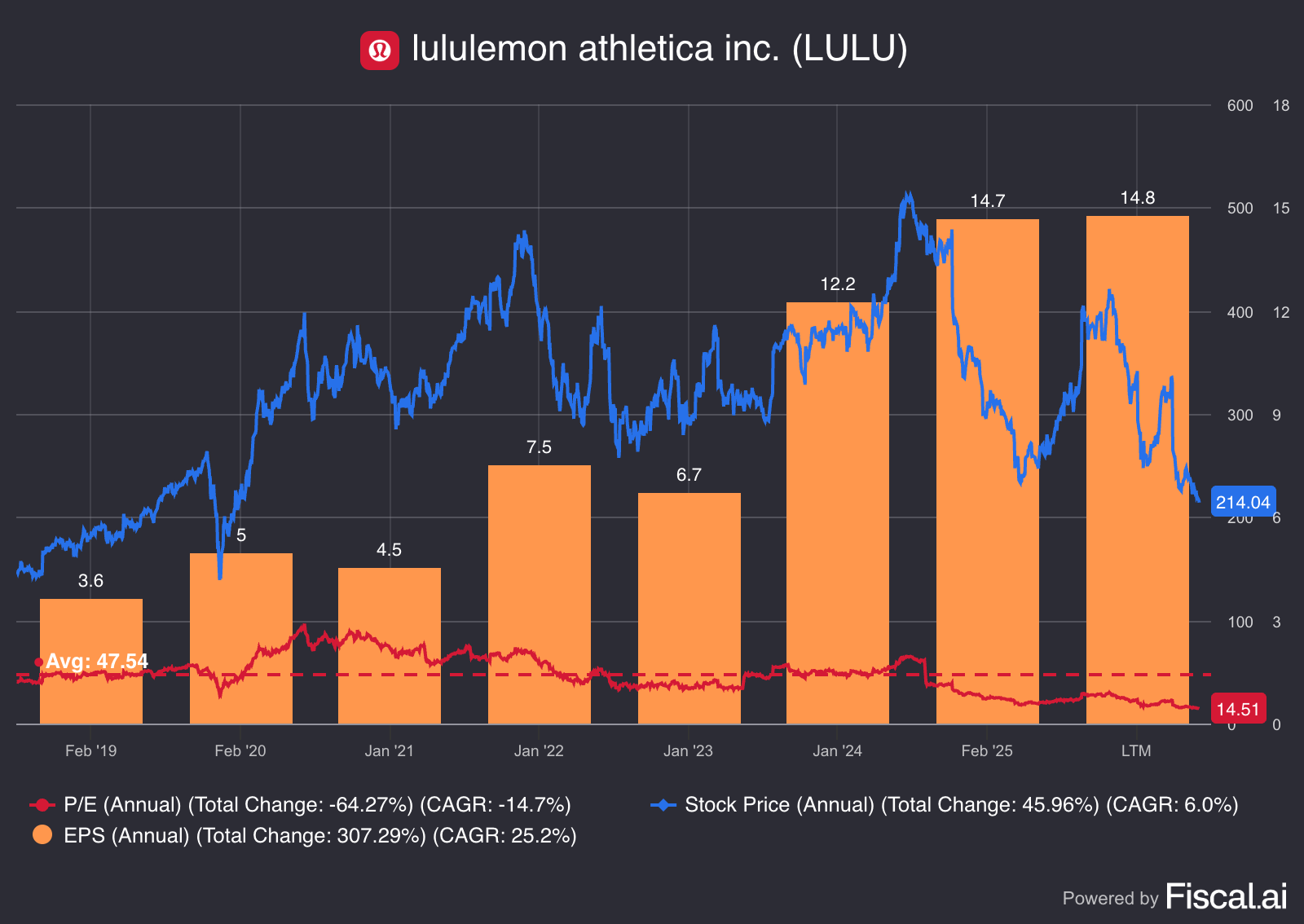 Lululemon wordt momenteel verhandeld tegen een koers-winstverhouding (PE) van 14,7x, vergeleken met een zesjarig gemiddelde van 47,5x.