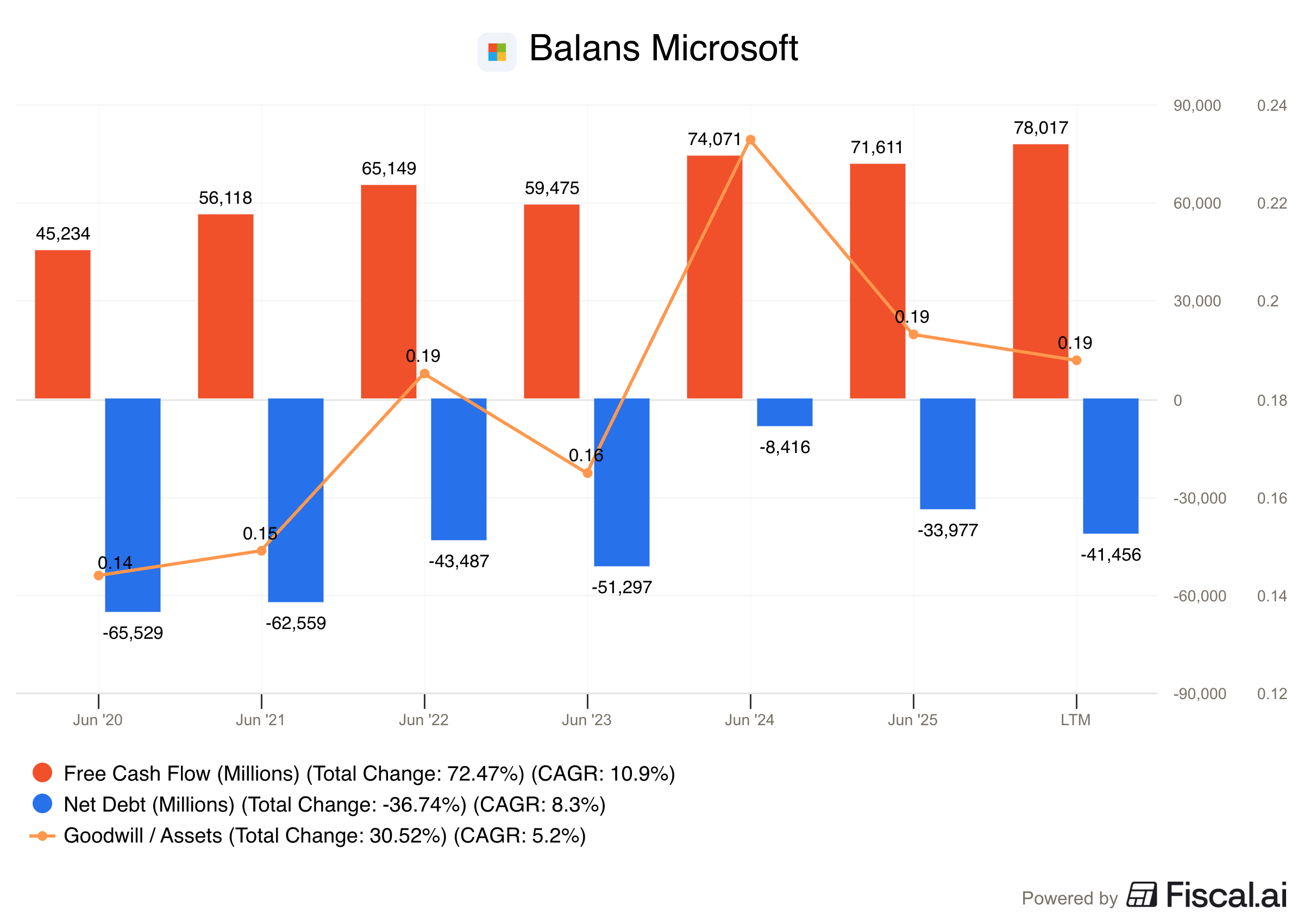 Ga naar ‘Financials’ en typ in de kleine zoekbalk onderaan ‘Net Debt’, ‘Free Cash Flow’, en ‘Goodwill/assets’ in. Je krijgt dan deze grafiek te zien: