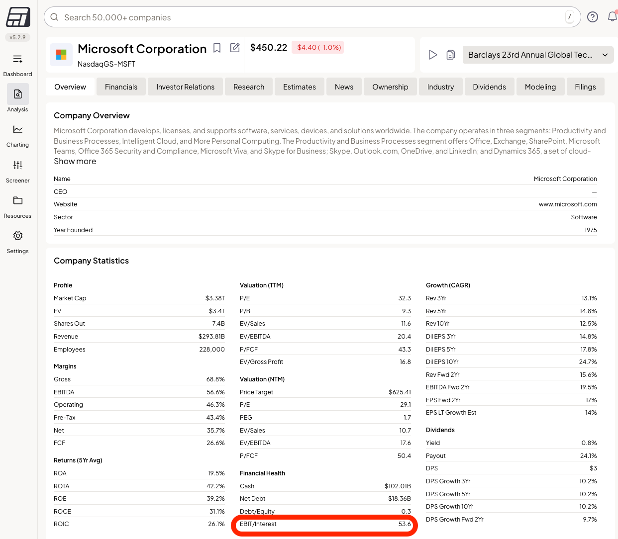 Nu kom je uit op de ‘Company Overview’ pagina. Je ziet meteen de eerste ratio, Interest Coverage ofwel EBIT/Interest staan: