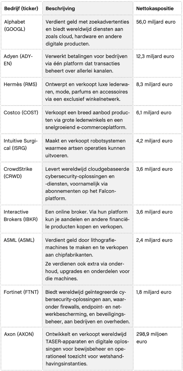 In deze tabel kun je tien bedrijven met een nettokaspositie terugvinden.