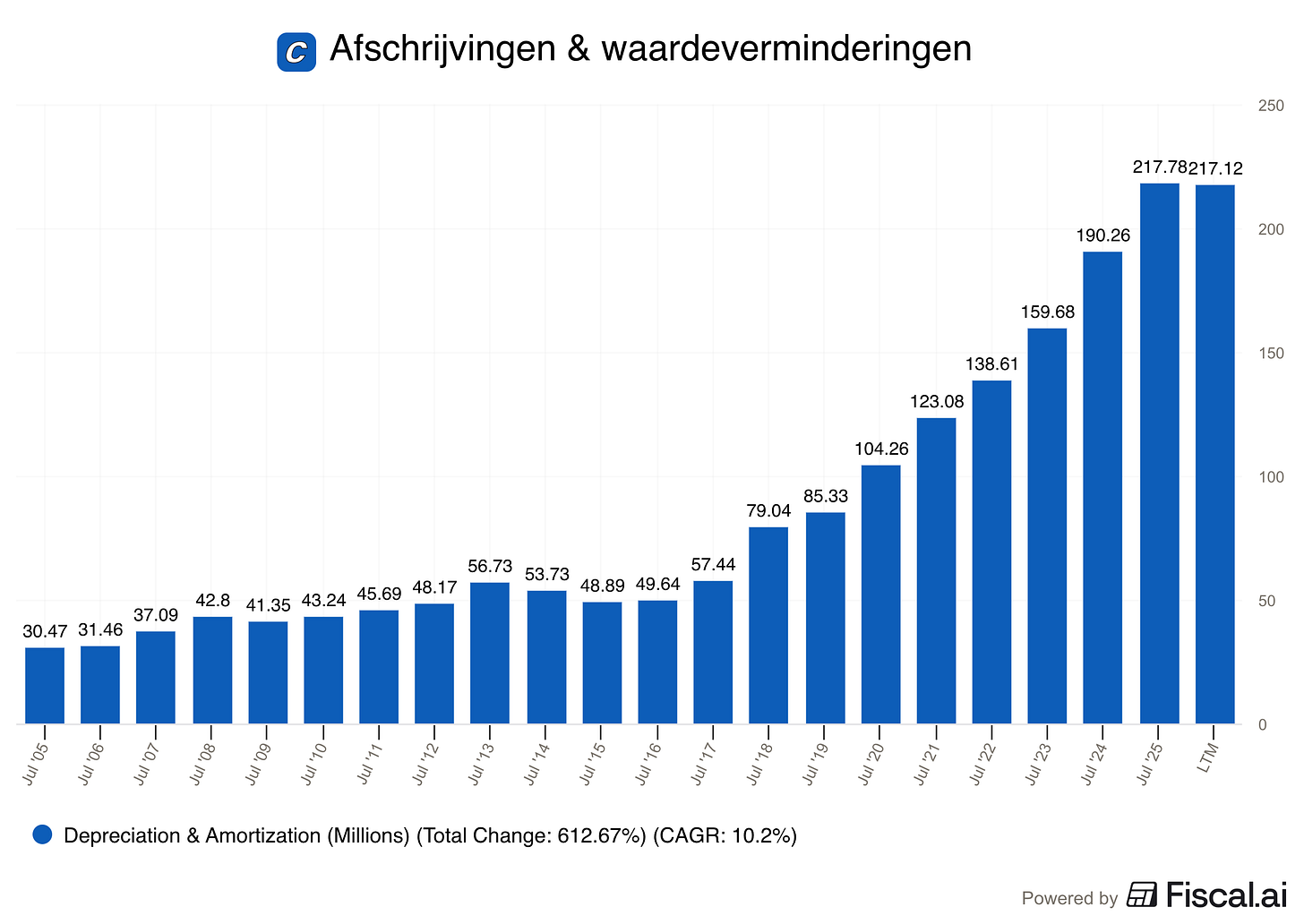 waarbij onderhouds-CAPEX = afschrijvingen & waardeverminderingenVia Fiscal.ai gaan we nu op zoek naar de afschrijvingen & waardeverminderingen (Depreciation & Amortization).