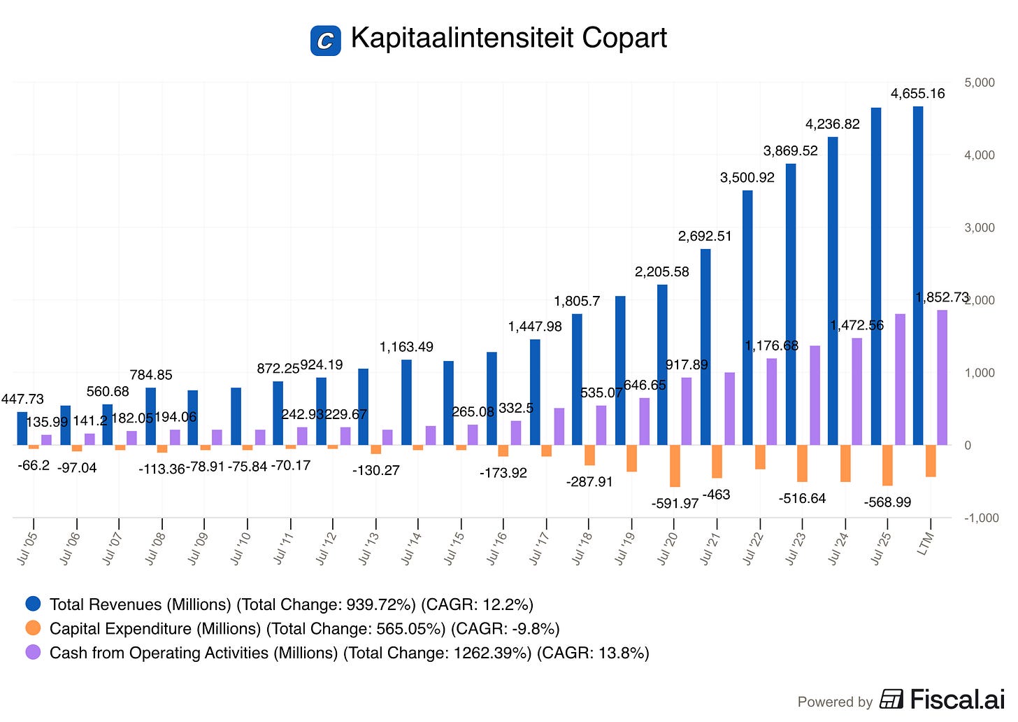 CAPEX/operationele cashflow = 569 miljoen dollar / 1.800 miljoen dollar = 31,6%Copart ziet er met andere woorden vrij kapitaalintensief uit.