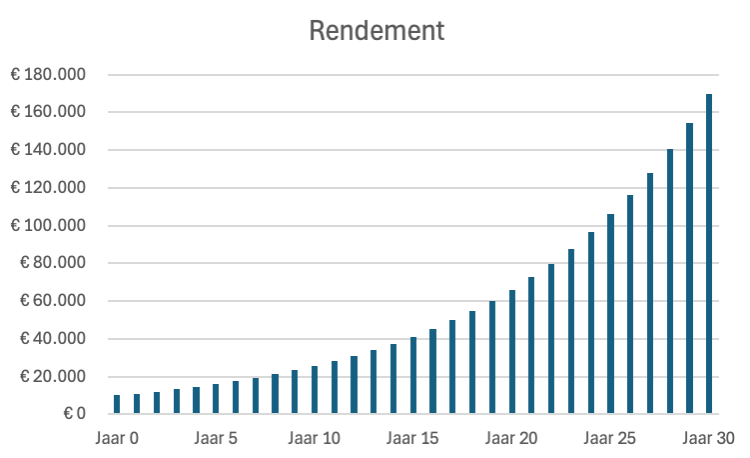Stel je voor dat je €10.000 hebt om te investeren voor 40 jaar en dat je elke maand €200 toevoegt aan je beleggingsportefeuille.