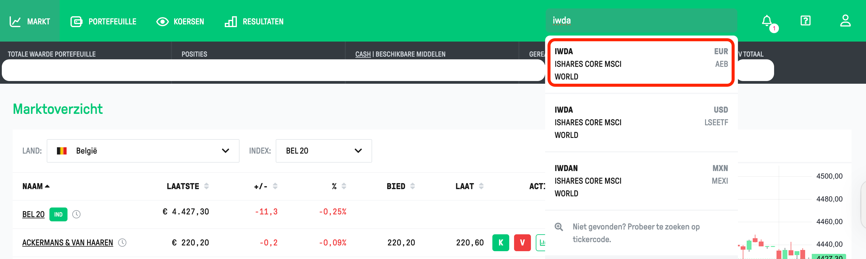 In de zoekbalk bovenaan typ je ‘IWDA’ in. Je hebt hier verschillende opties. Ik kies voor de eerste omdat deze noteert op de beurs van Amserdam en in euro noteert:
