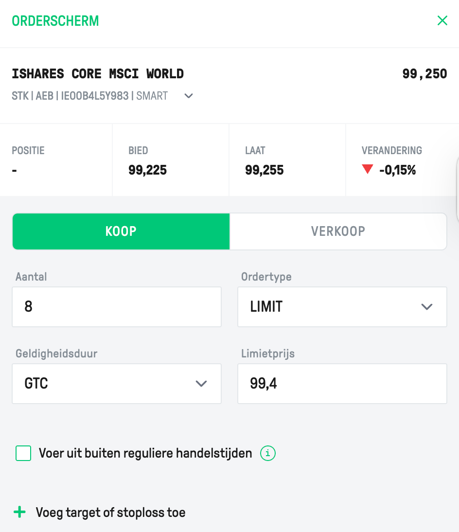 Ik wil voor €833,3 IWDA kopen en de huidige koers is gelijk aan €99,25. Ik kan met dit bedrag dus 8 stuks IWDA kopen. Ik plaats een limietorder voor €99,40.