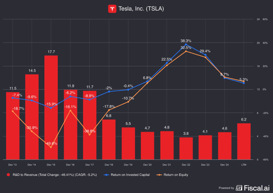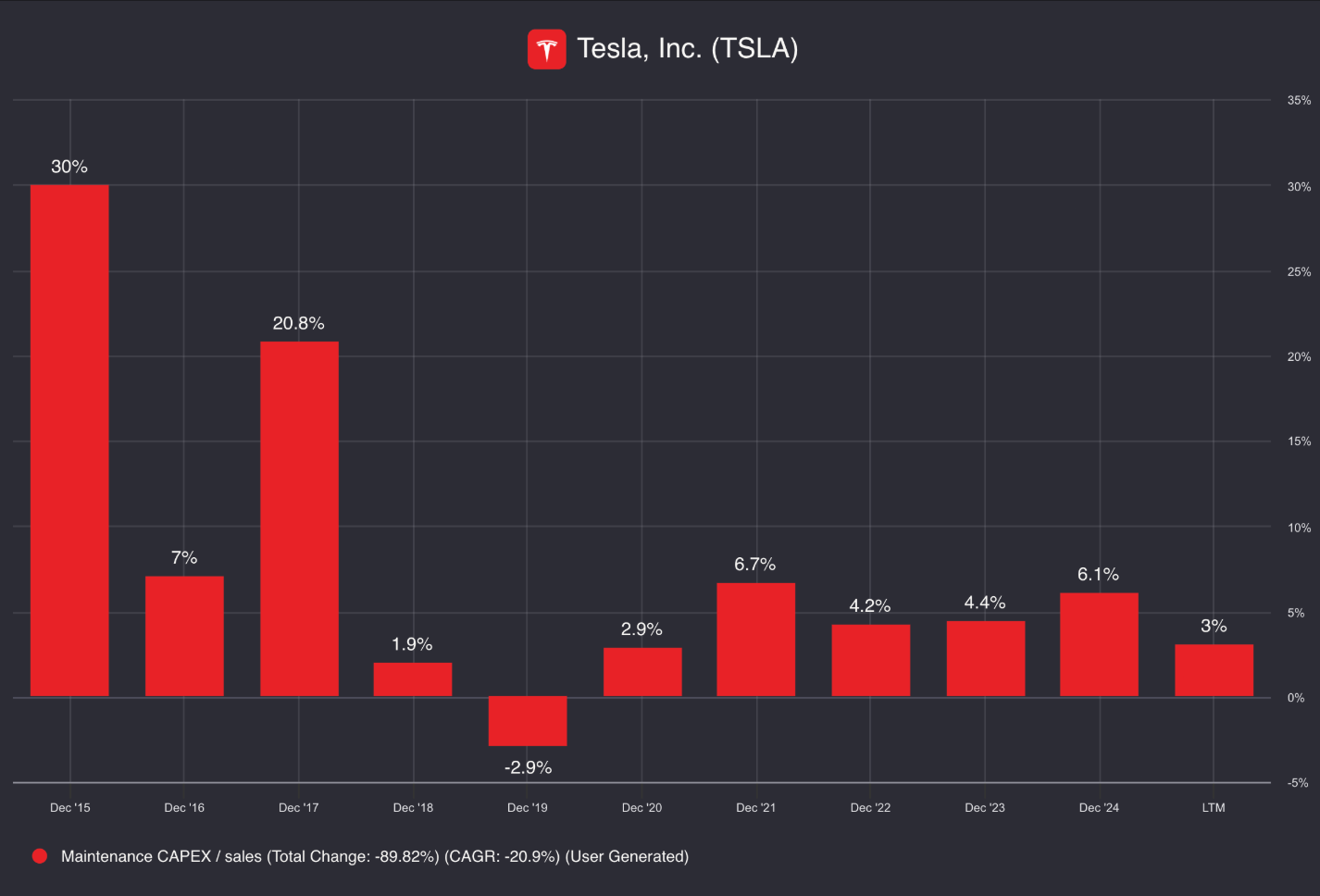 Maar als je enkel de maintenance CAPEX (het geld dat Tesla uitgeeft om bestaande fabrieken draaiende te houden) bekijkt, daalt de kapitaalintensiteit sterk: