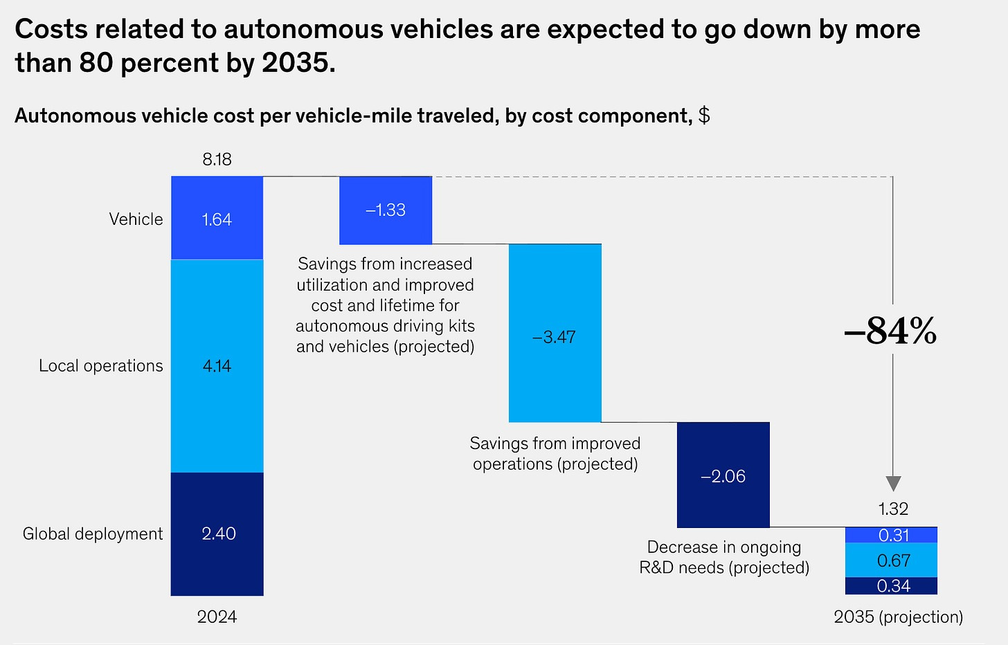 Volgens adviesbureau McKinsey zullen de kosten van autonome voertuigen de komende tien jaar met 80% dalen.