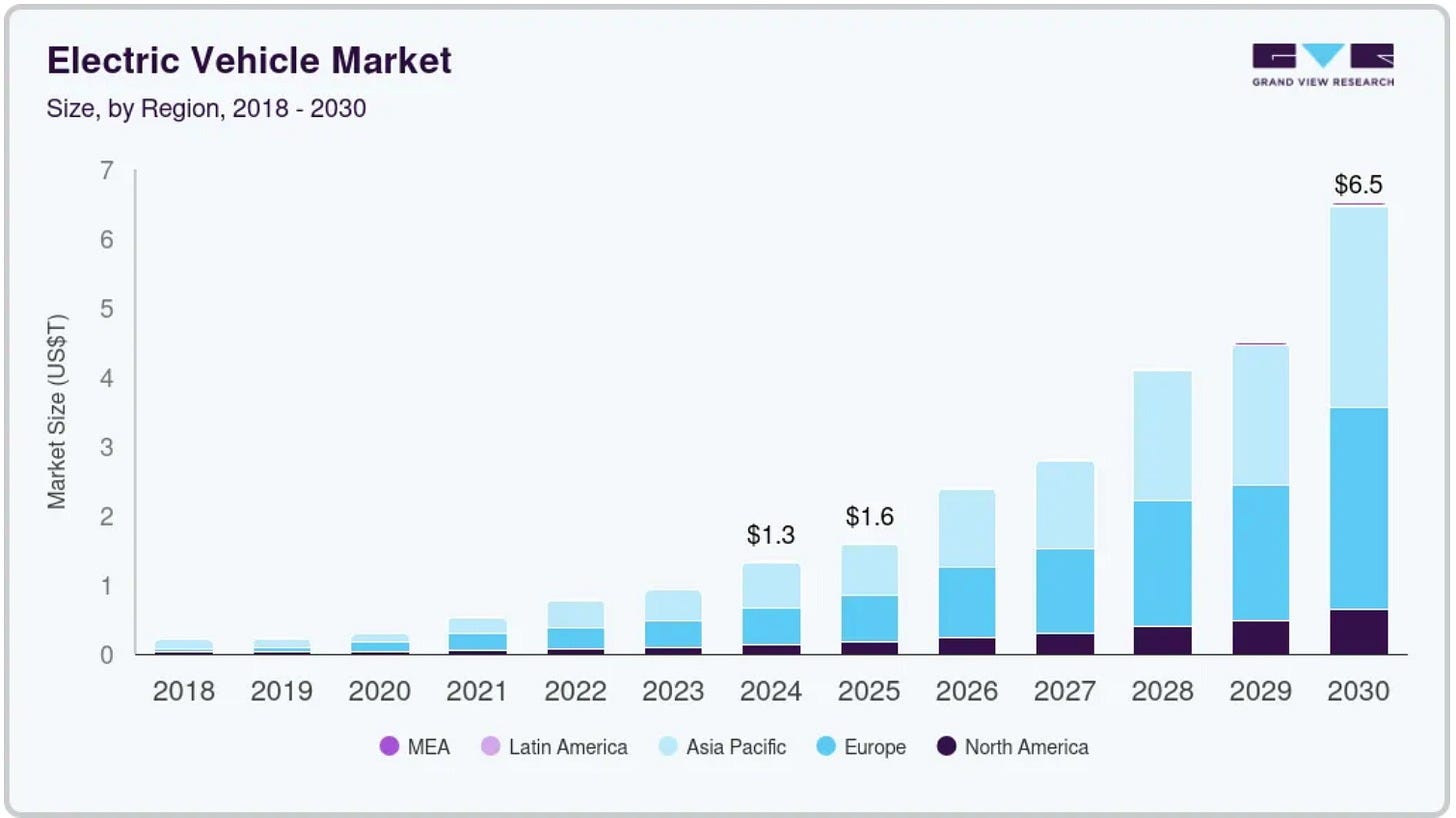 Tegen 2030 zou die markt meer dan $6 biljoen waard moeten zijn. Dat is een groei van 32% per jaar.
