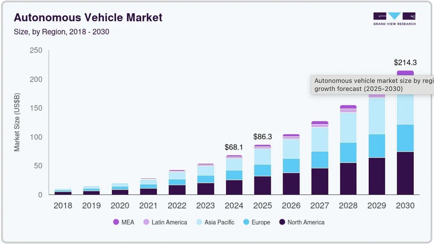 De wereldwijde markt voor autonome voertuigen kan in 2030 meer dan $214 miljard waard zijn.