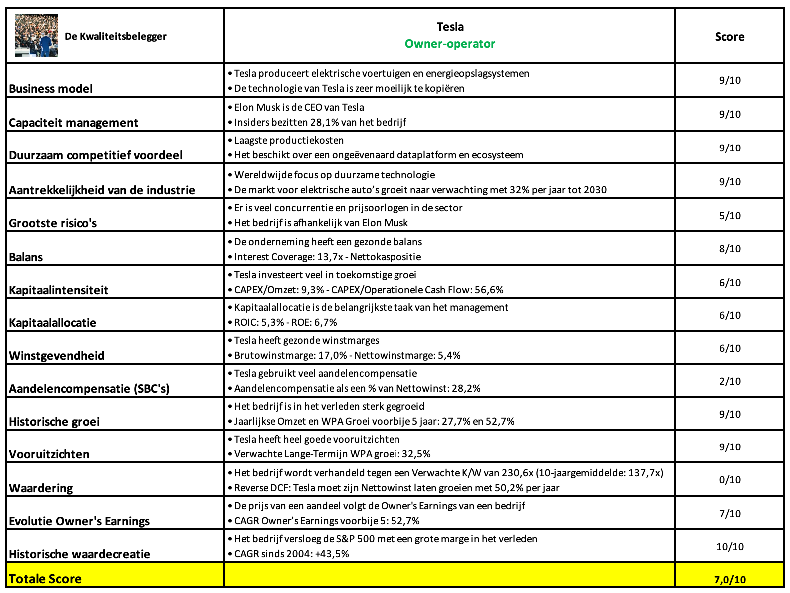 Zoals je in onderstaande tabel kan zien, behaalt Tesla een kwaliteitsscore van 7,0/10: