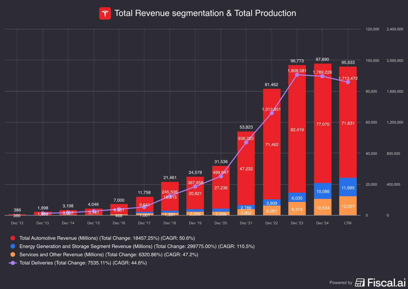Energieopwekking en -opslag (10,3% van de omzet): Ze verkopen zonnepanelen en grote batterijen (“megapacks”) om energie op te slaan voor steden en datacenters. Dit segment groeit het snelst.
