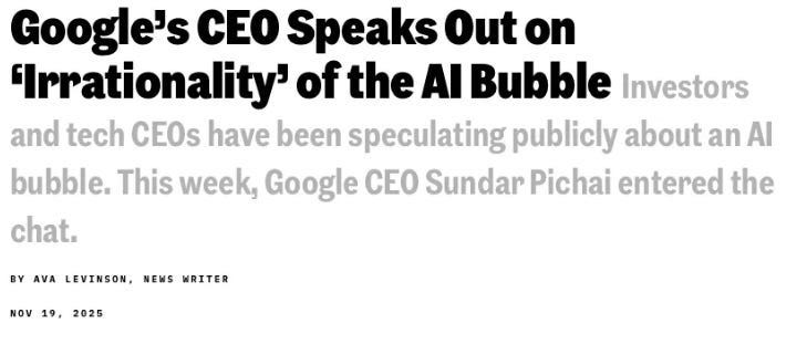 “Er was duidelijk sprake van overinvesteringen, maar niemand van ons zou eraan twijfelen dat het internet diepgaand was of dat het veel impact had. Het heeft de manier waarop we als samenleving digitaal werken fundamenteel veranderd. Ik verwacht voor AI hetzelfde.” - Sundar Pichai, CEO van Google“Ik denk dat er zeker mogelijks sprake is van een zeepbel, tenminste empirisch gezien.” - Mark Zuckerberg, CEO van MetaEn weet je wat? Als Big Tech crasht, zal de hele beurs volgen.