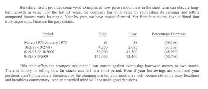 De beurskoers van Berkshire Hathaway is vier keer gehalveerd sinds Warren Buffett het roer overnam in 1965.