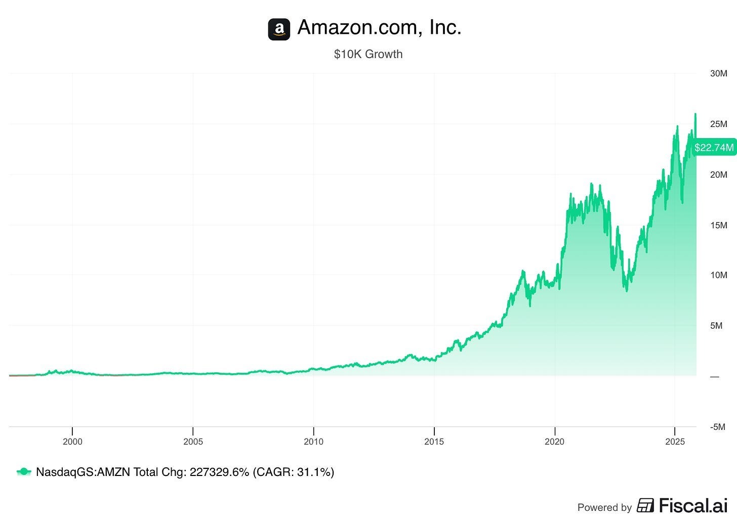 Een belegging van $10.000 in Amazon in 1997 is vandaag maar liefst $22 miljoen (!) waard.