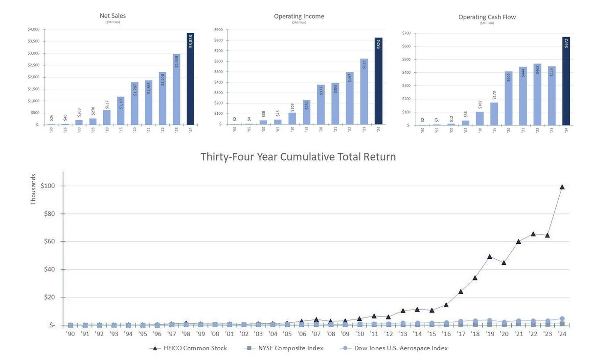 De cijfers blijven verbeteren: De omzet groeide met 14% en de operationele winst met 15% in het laatste kwartaal. Oudere vliegtuigen vliegen meer dan ooit, en originele fabrikanten blijven hun prijzen verhogen, wat Heico’s korting elk jaar aantrekkelijker maakt.