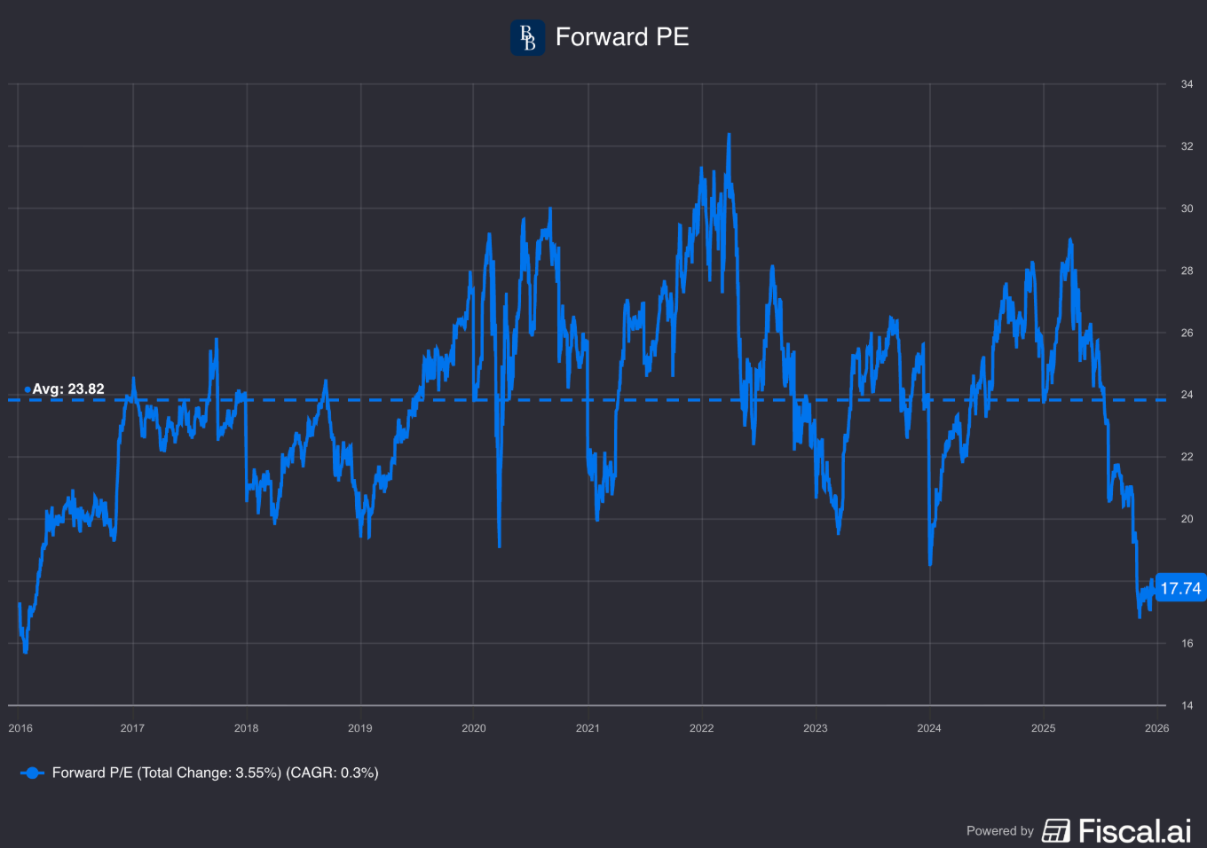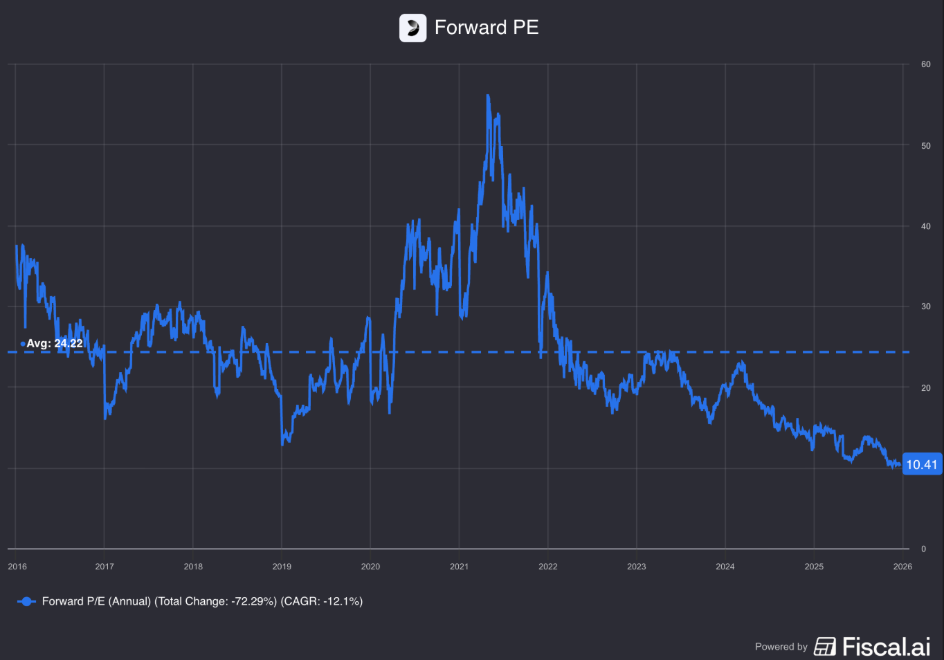 Het aandeel staat momenteel laag gewaardeerd. Het noteert zelfs aan één van de laagste waarderingen van de afgelopen tien jaar.
