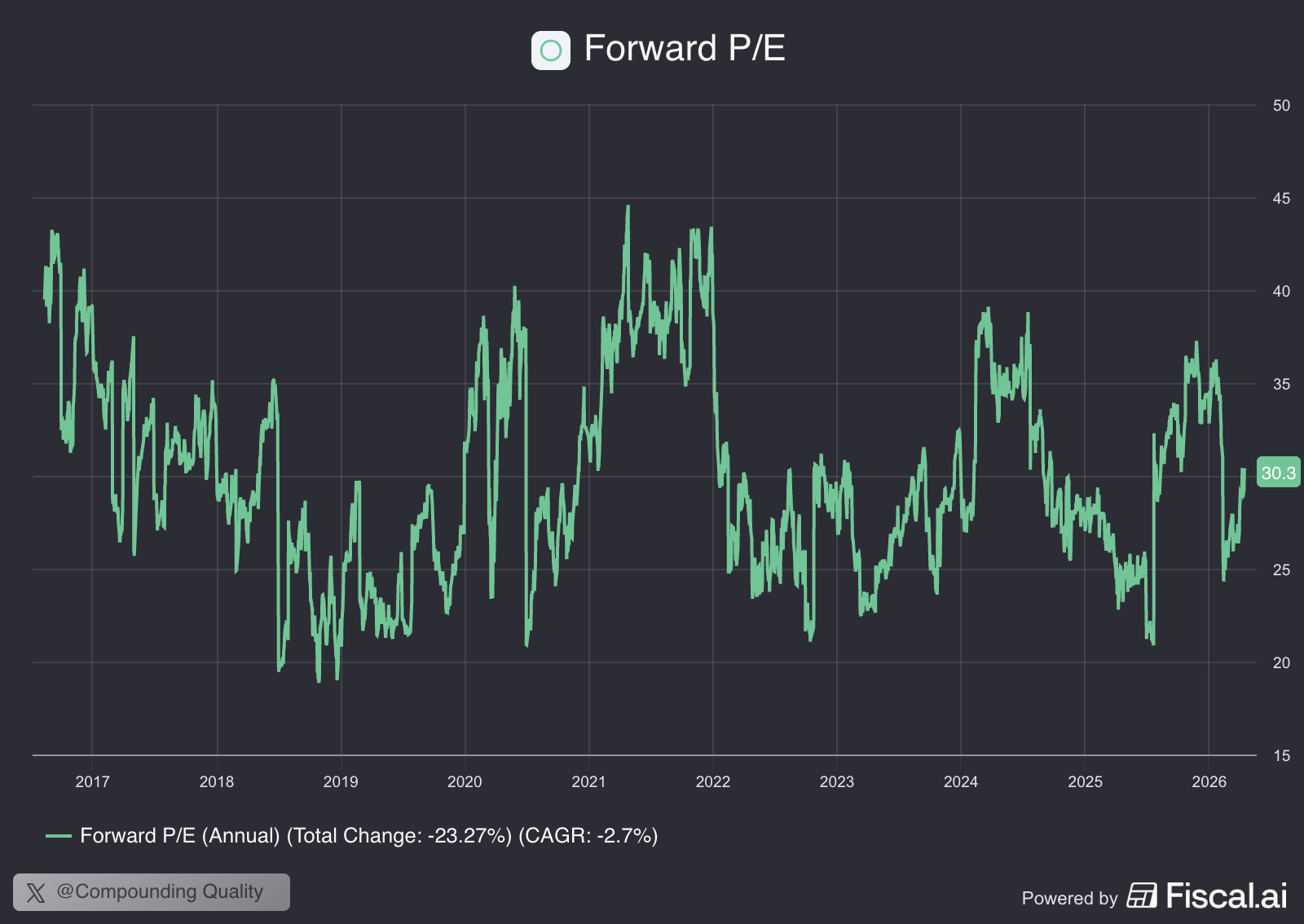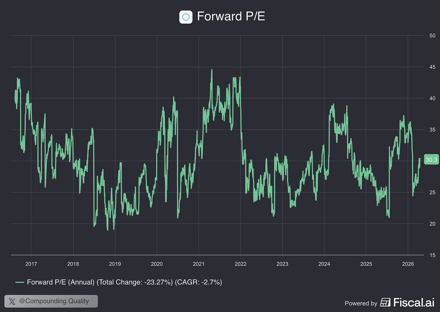 Het aandeel noteert momenteel aan een forward PE van 30,6x.
