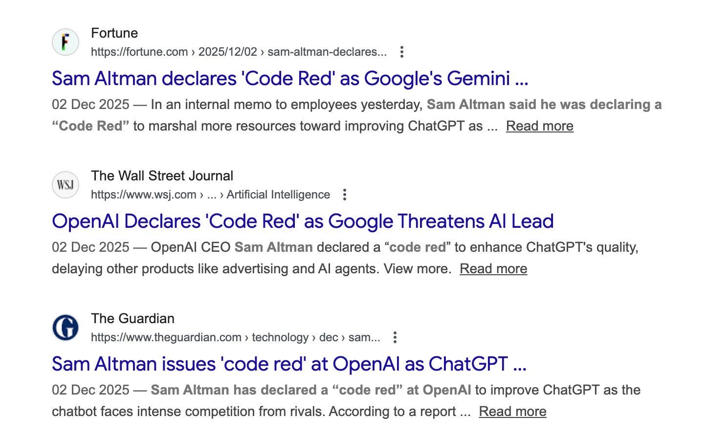 OpenAI-CEO Sam Altman heeft zelfs “code rood” uitgeroepen om de achterstand op de Gemini 3-modellen van Google in te halen.