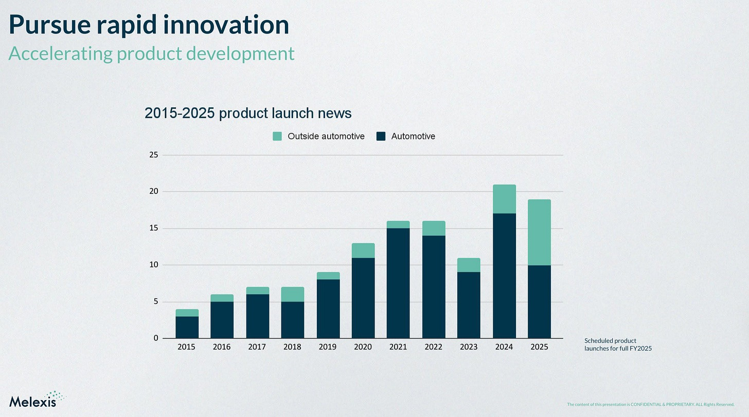 Zoals je kan zien op de grafiek, brengt Melexis daarom steeds meer producten op de markt buiten de autosector: