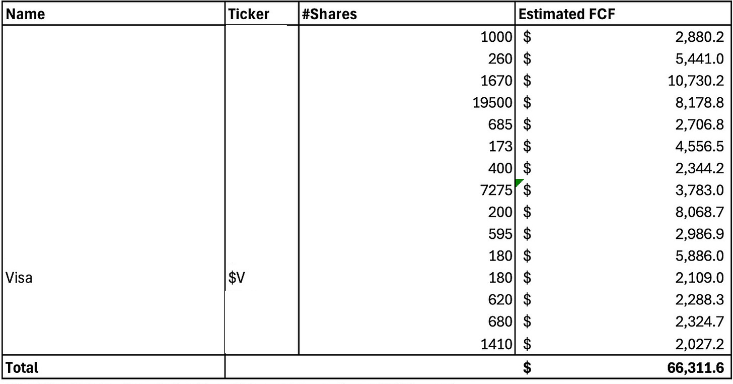 Zo heb ik 180 aandelen Visa. Visa zal naar verwachting de komende 12 maanden een Free Cash Flow per Aandeel van $11,7 genereren.