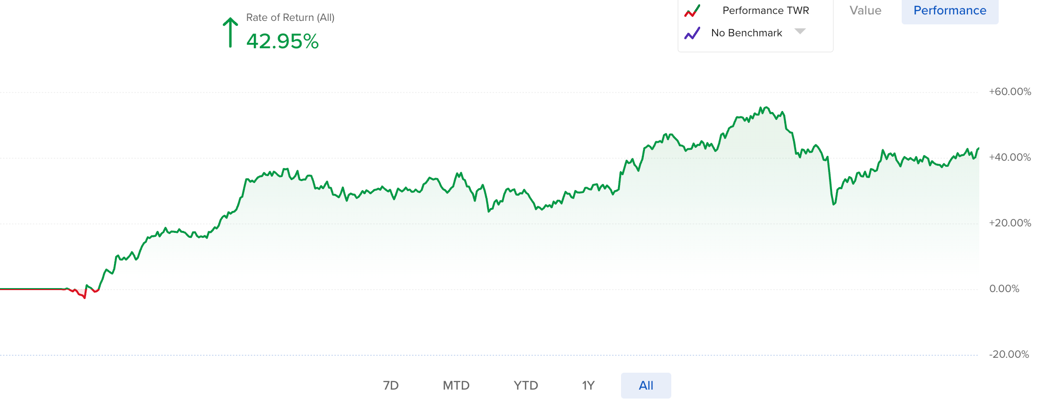 Hieronder zie je het jaarlijkse rendement van onze Portefeuille sinds de start in oktober 2023.