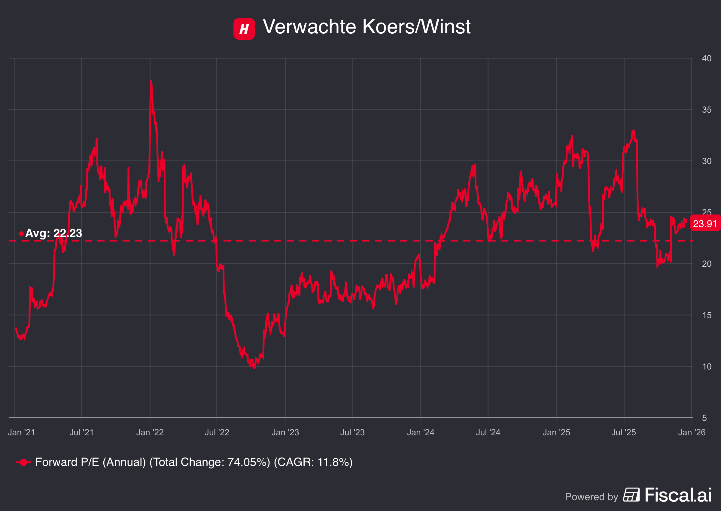 De afgelopen 5 jaar bedroeg de gemiddelde koerswinstverhouding 22,2x.