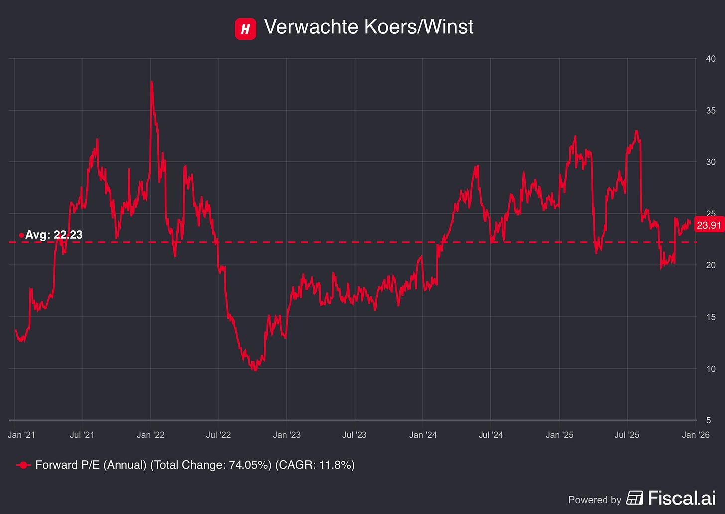 Koers-winstverhouding: 23,9x (Lager dan het gemiddelde van de afgelopen 5 jaar (22,2x)? ❌)