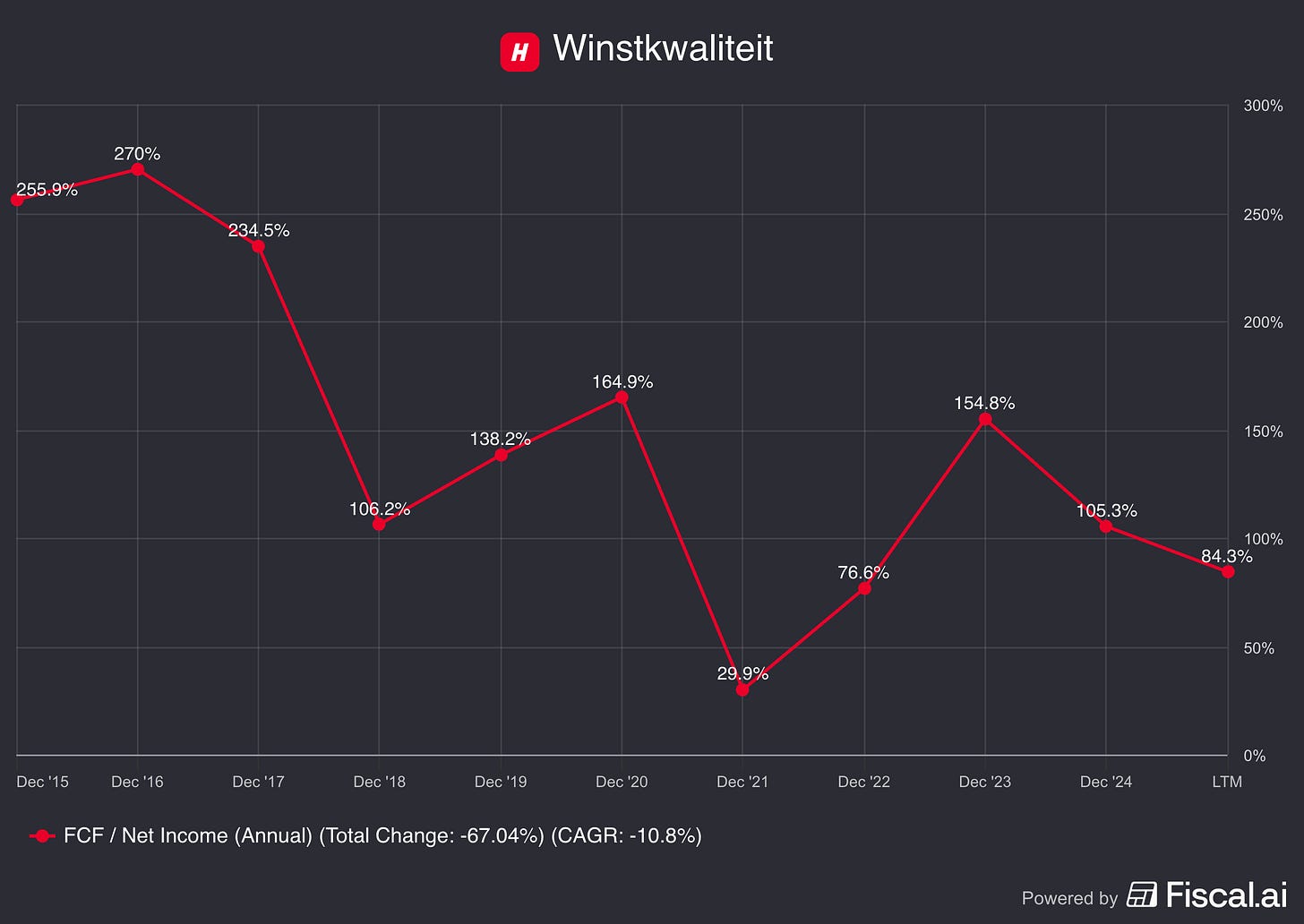 Als vuistregel wil ik dat de vrije kasstroom/nettowinst hoger is dan 80,0%.
