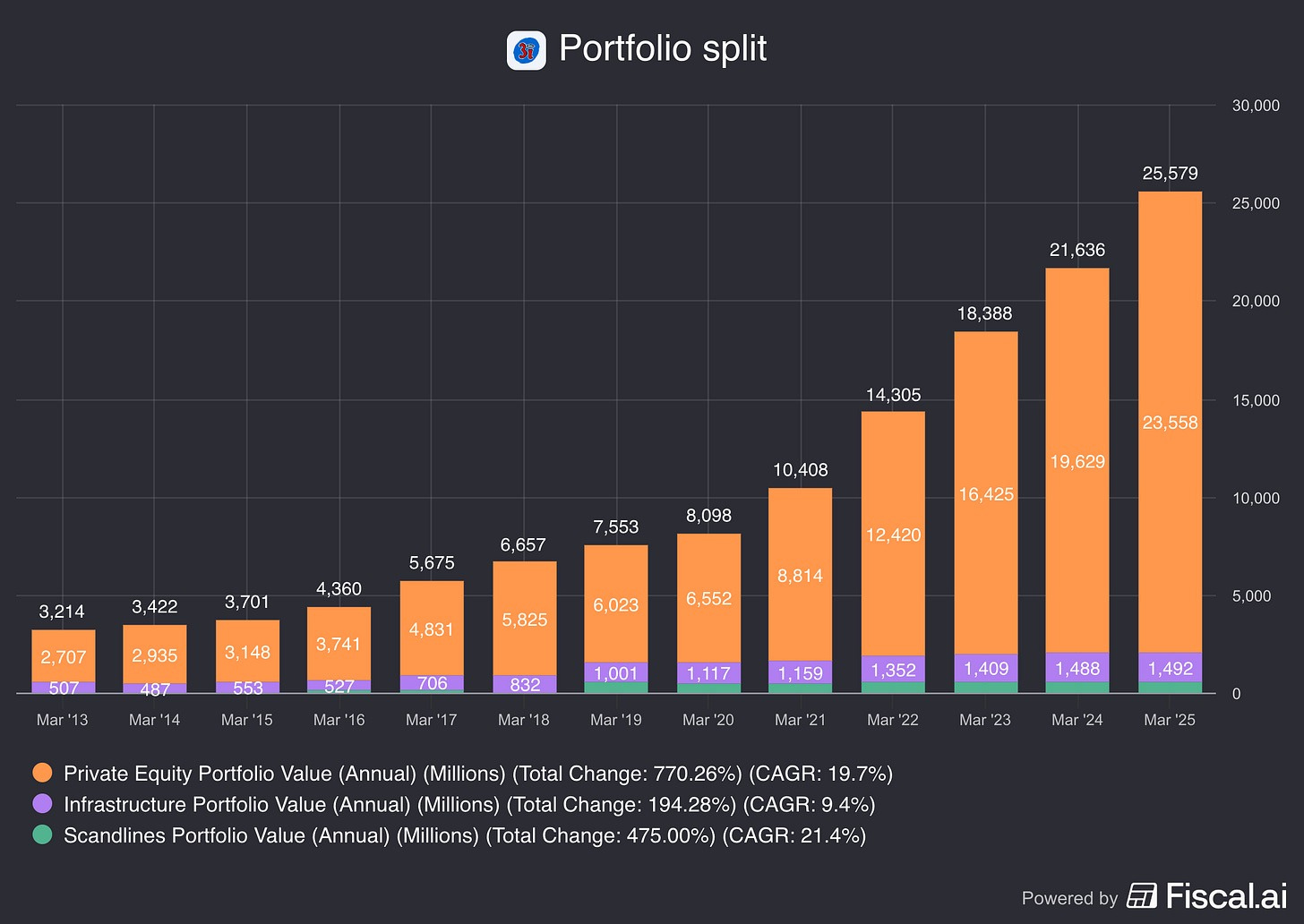 “Dit is het vijfde jaar op rij dat we een totaalrendement van meer dan 20% hebben behaald. Over dezelfde periode bedroeg ons gemiddelde jaarlijkse totaalrendement 30%.” - CEO Simon BorrowsAls je nóg verder uitzoomt, zie je hoe krachtig compounding echt kan zijn: