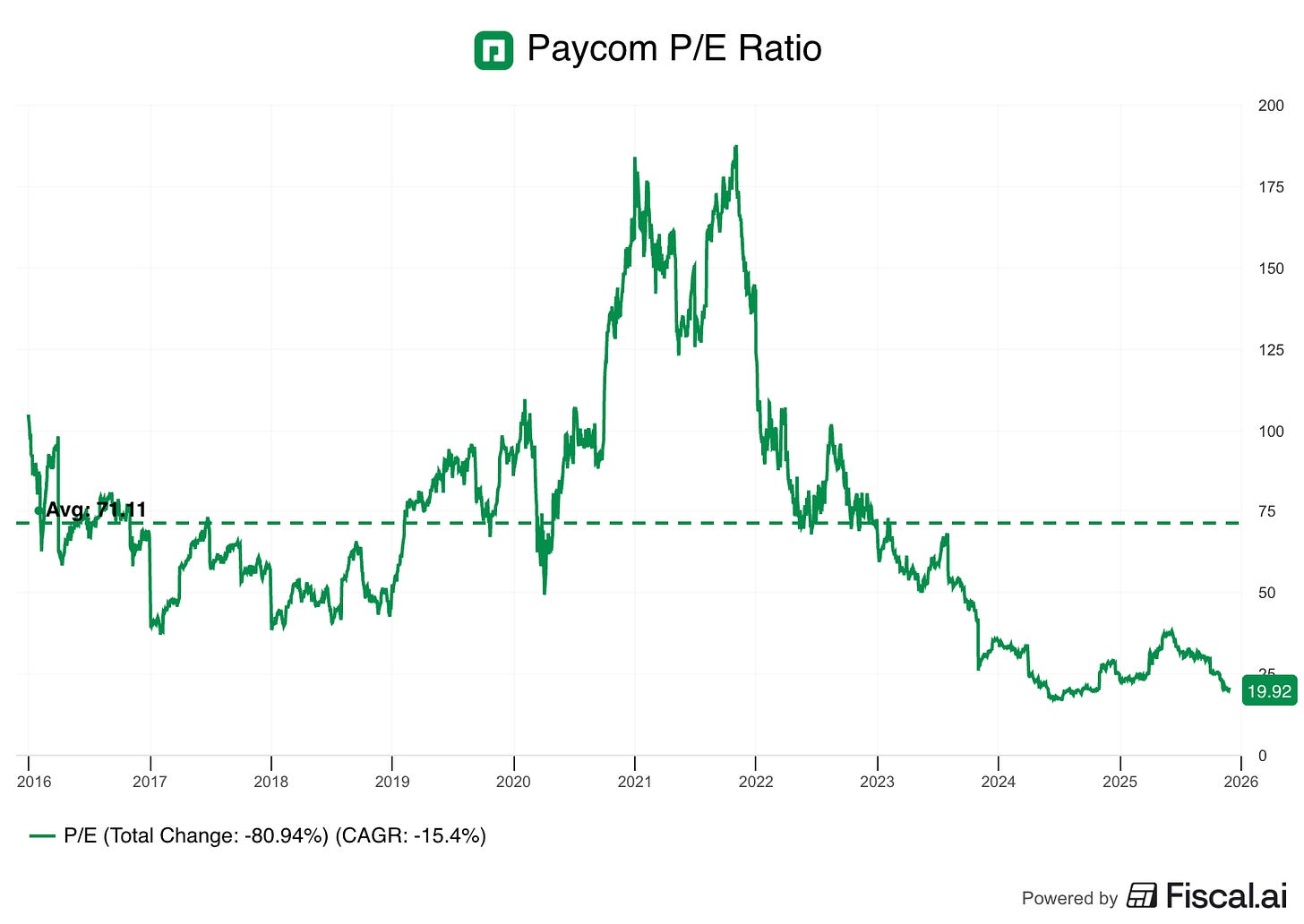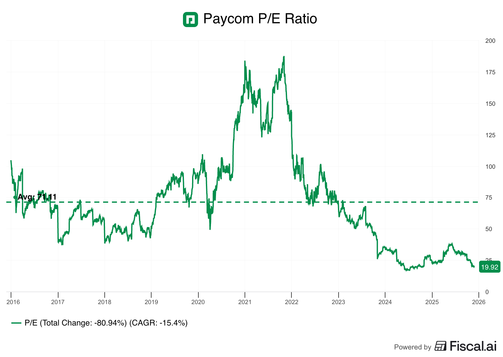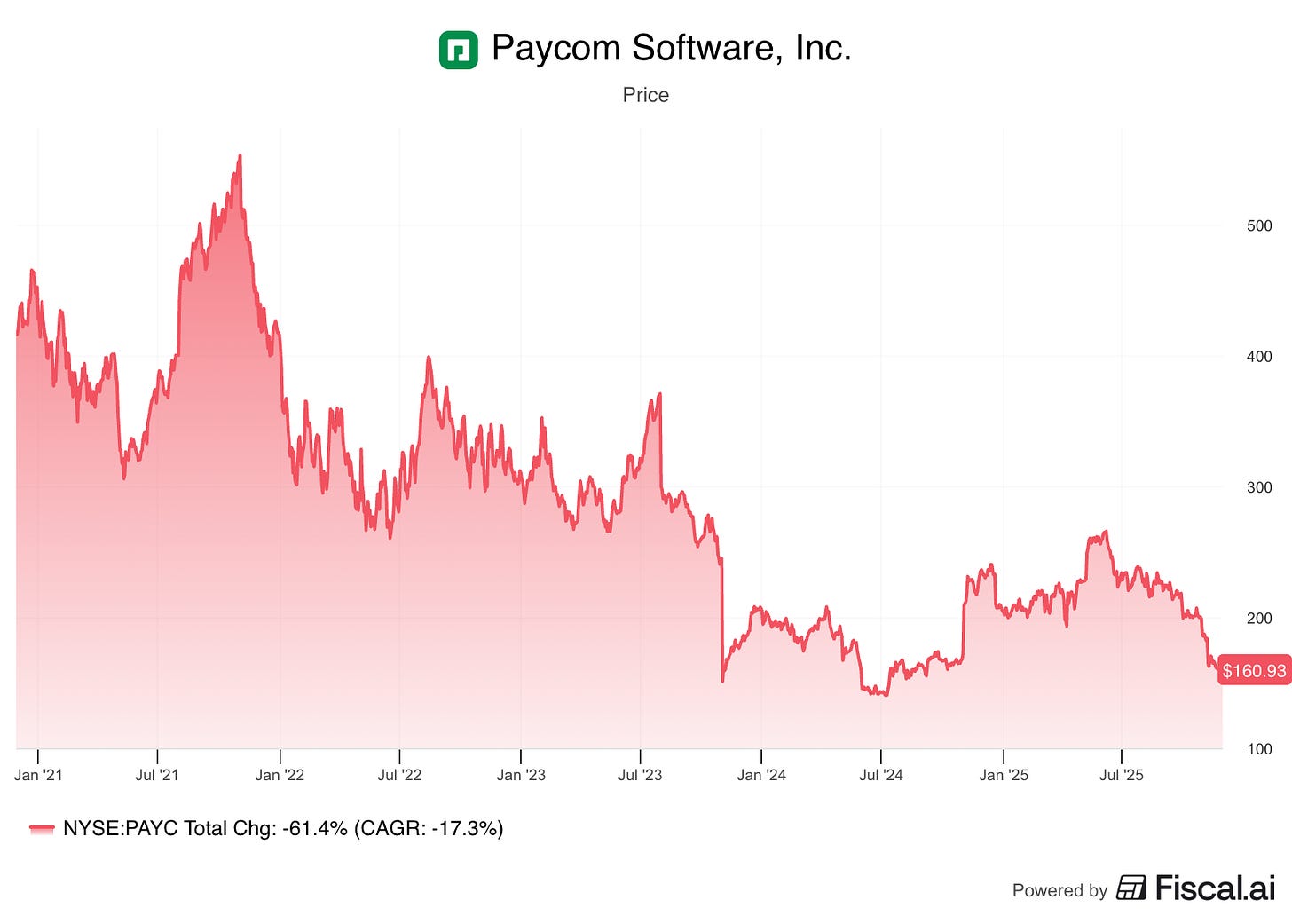 Paycom werd jaren gezien als een snelgroeiende techspeler. Beleggers betaalden een hoge prijs (gemiddeld 71x winst).