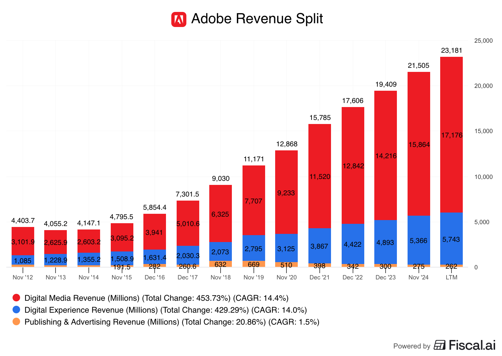 Adobe verkoopt vooral software-abonnementen. Denk aan programma’s voor creatieve makers, digitale documenten en marketing. Die inkomsten zijn voorspelbaar en winstgevend. Adobe haalt zelfs een brutomarge van boven de 85%.De omzet van Adobe bestaat uit Digital Media, Digital Experience en een klein deel Publishing & Advertising.