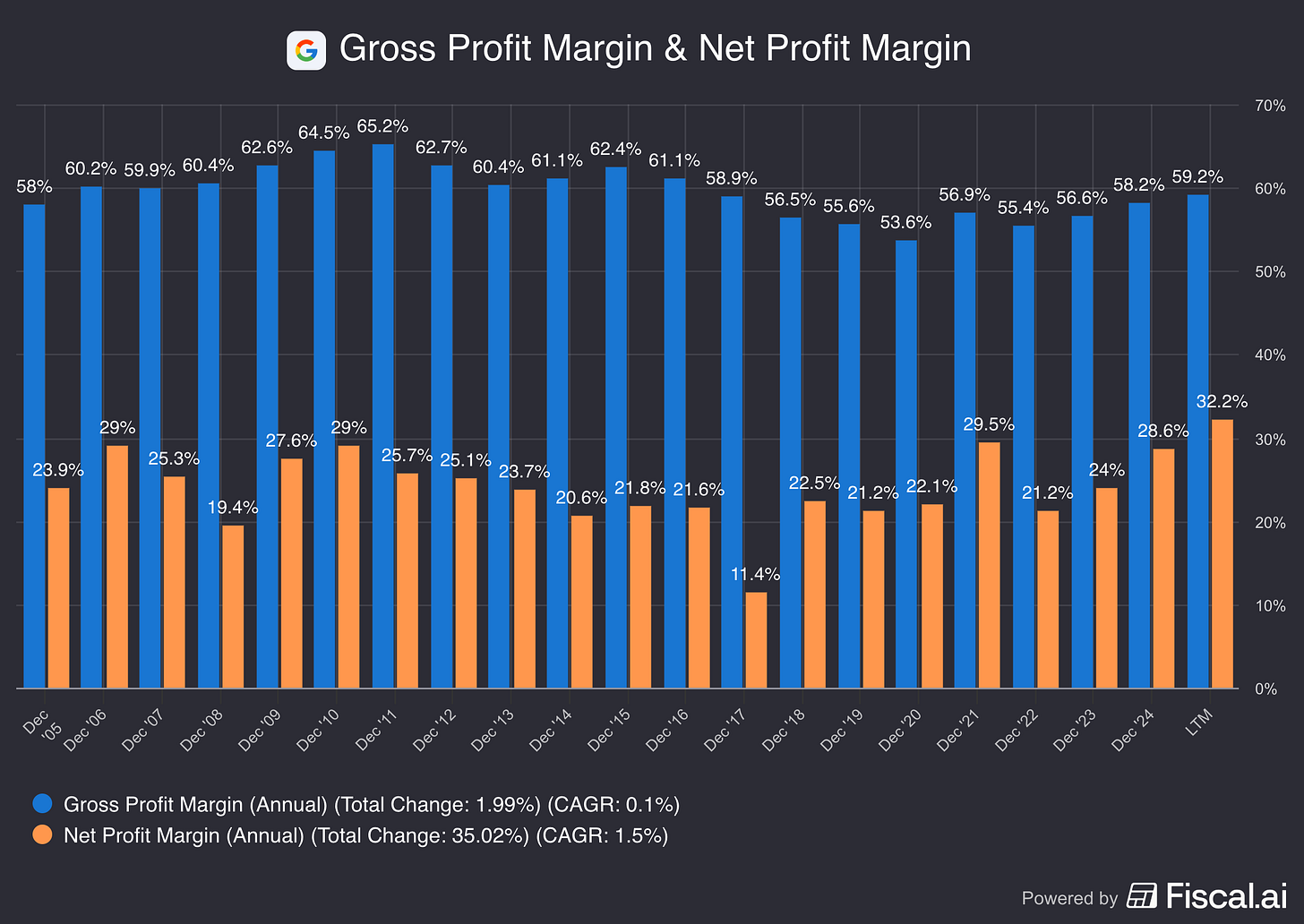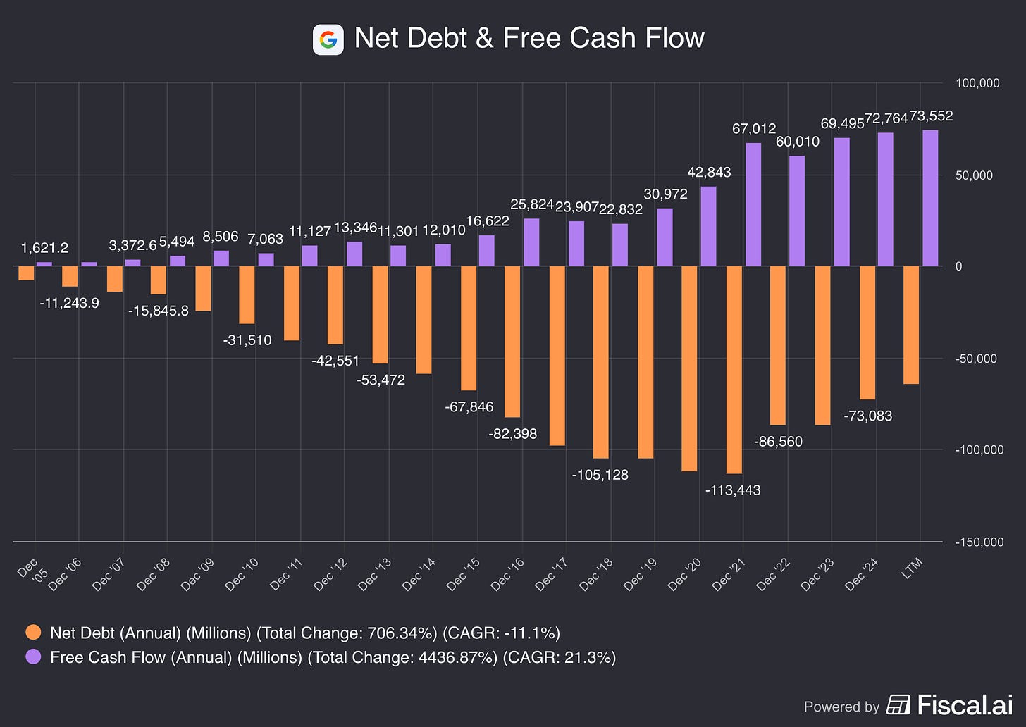 De Free Cash Flow/Nettowinst is iets lager omdat Google veel herinvesteert in toekomstige groei.