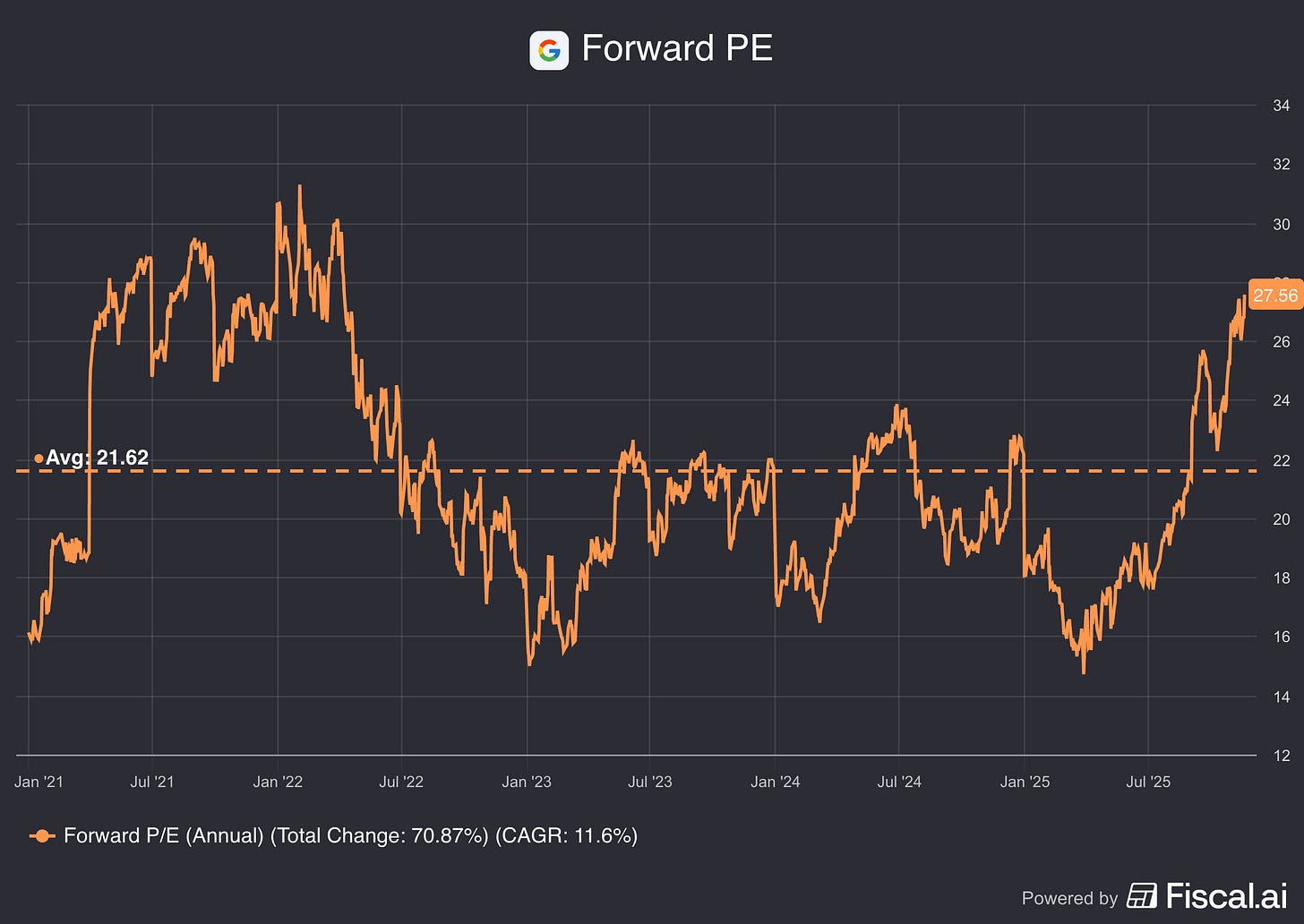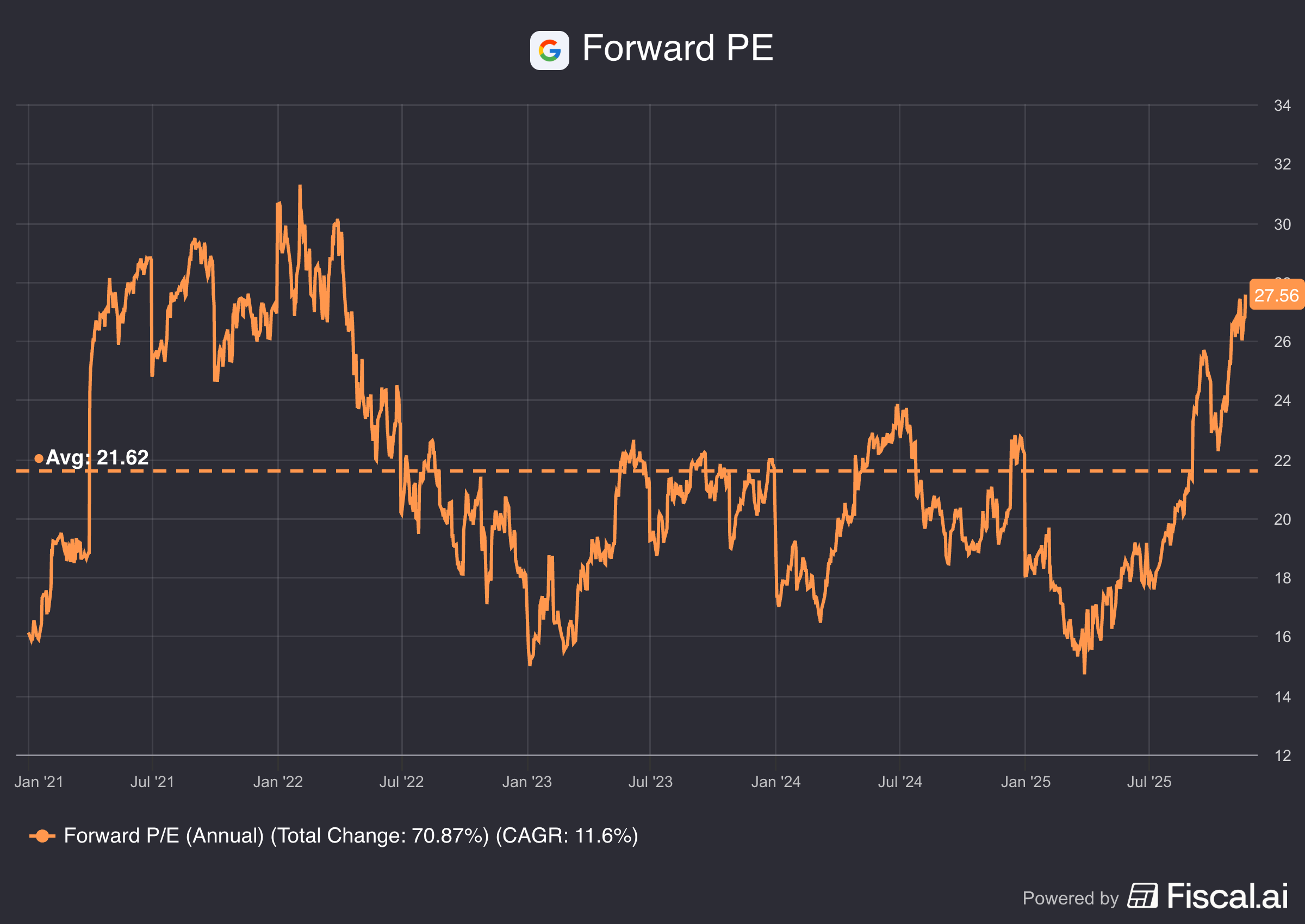 Google noteert aan 27,6x de verwachte winst versus een 5-jaarsgemiddelde van 21,6x.